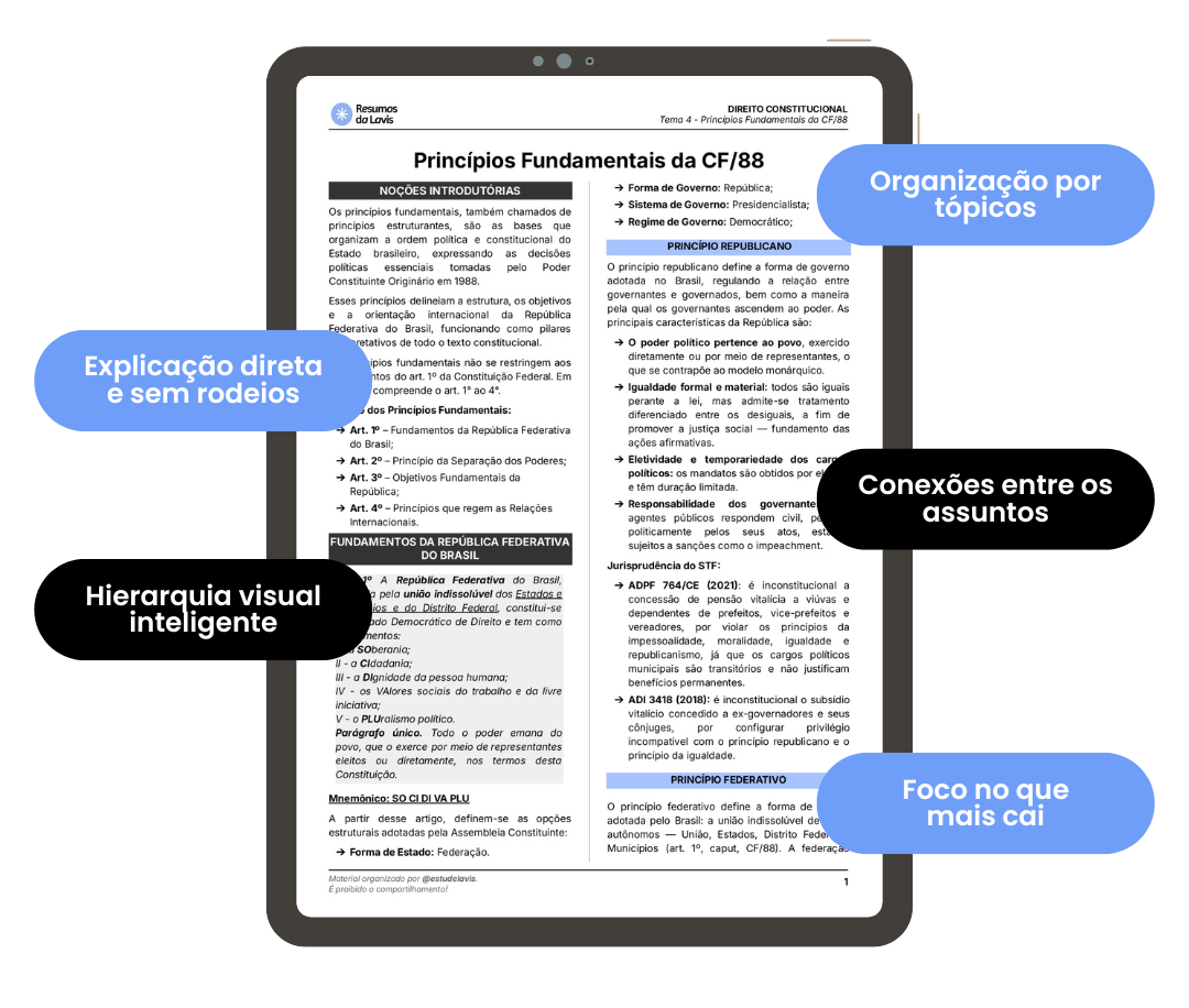 O material reúne doutrina sintetizada, jurisprudência atualizada, lei seca resumida, esquemas visuais e tópicos estratégicos para facilitar o estudo.